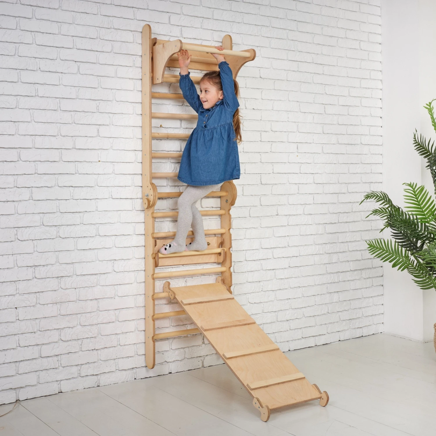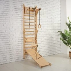 Convert the Triangle Ladder into an all-encompassing Swedish Wall. Ideal for various gymnastic endeavors and playful activities. While provided fasteners fit solid walls like brick or concrete, we suggest expert advice for drywall installations. - Art Add-on: