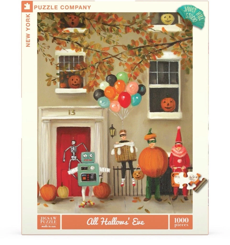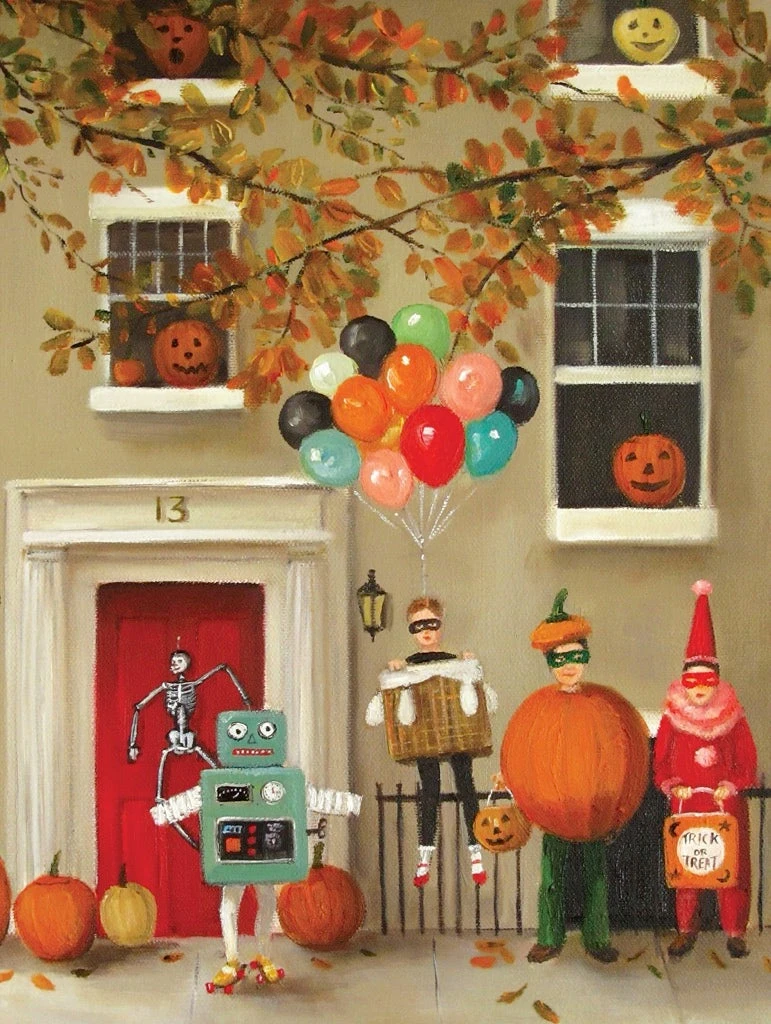 Some trick-or-treaters, including a robot, air balloon, pumpkin, and a clown, head out to collect some candy on Halloween night.