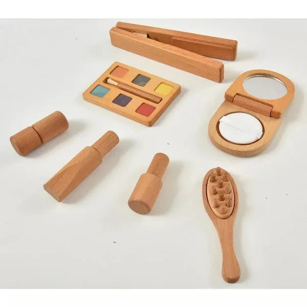 - 7 Piece Set: 1 Wood Hair Iron, 1 Wood Hand Cream Bottle, 1 Wood HairBrush, 1 Wood Lipstick, 1 Wood Nail Polish, 1 Wood Mirror w/ reflective Mirror Surface, 1 Wood Compact Powder and 1 Wood Perfume.