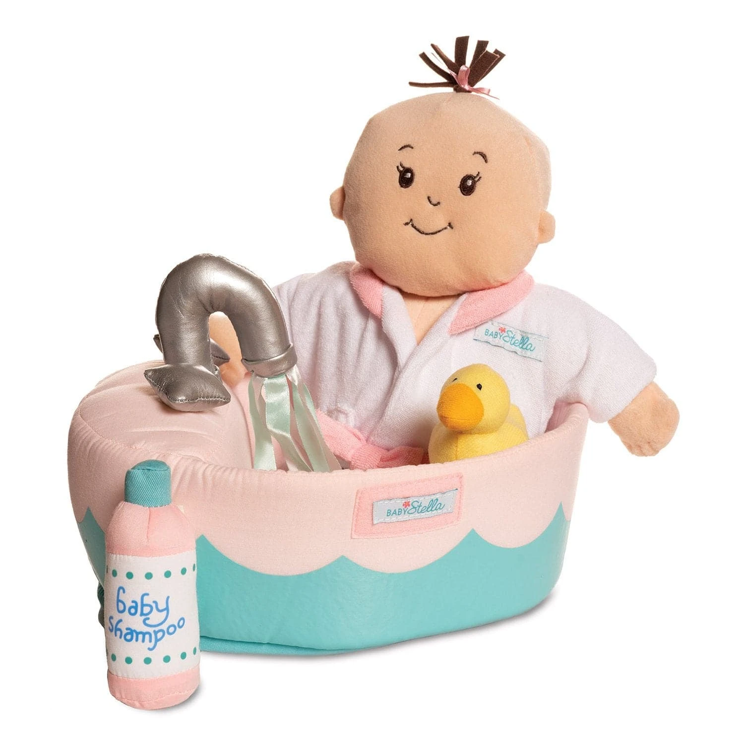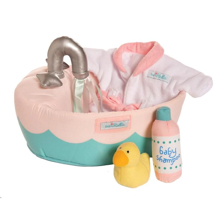 Baby Stella needs a bath! A soft tub with faux running water made of ribbon. Comes with a bathrobe, soft ducky, and soft shampoo bottle. The perfect Baby Stella accessory for your child’s soft doll collection.9Ages 12 months+