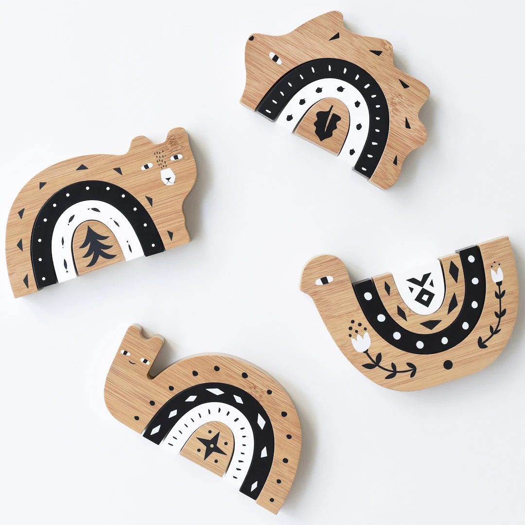An arch or rainbow style stacker puzzle in adorable animal form, uniquely designed in Wee Gallery style — sure to delight toddlers and young children who enjoy balancing, problem solving, and imaginary play activities. A perfect addition to your scandinavian, woodland, or nature themed nursery decor.