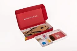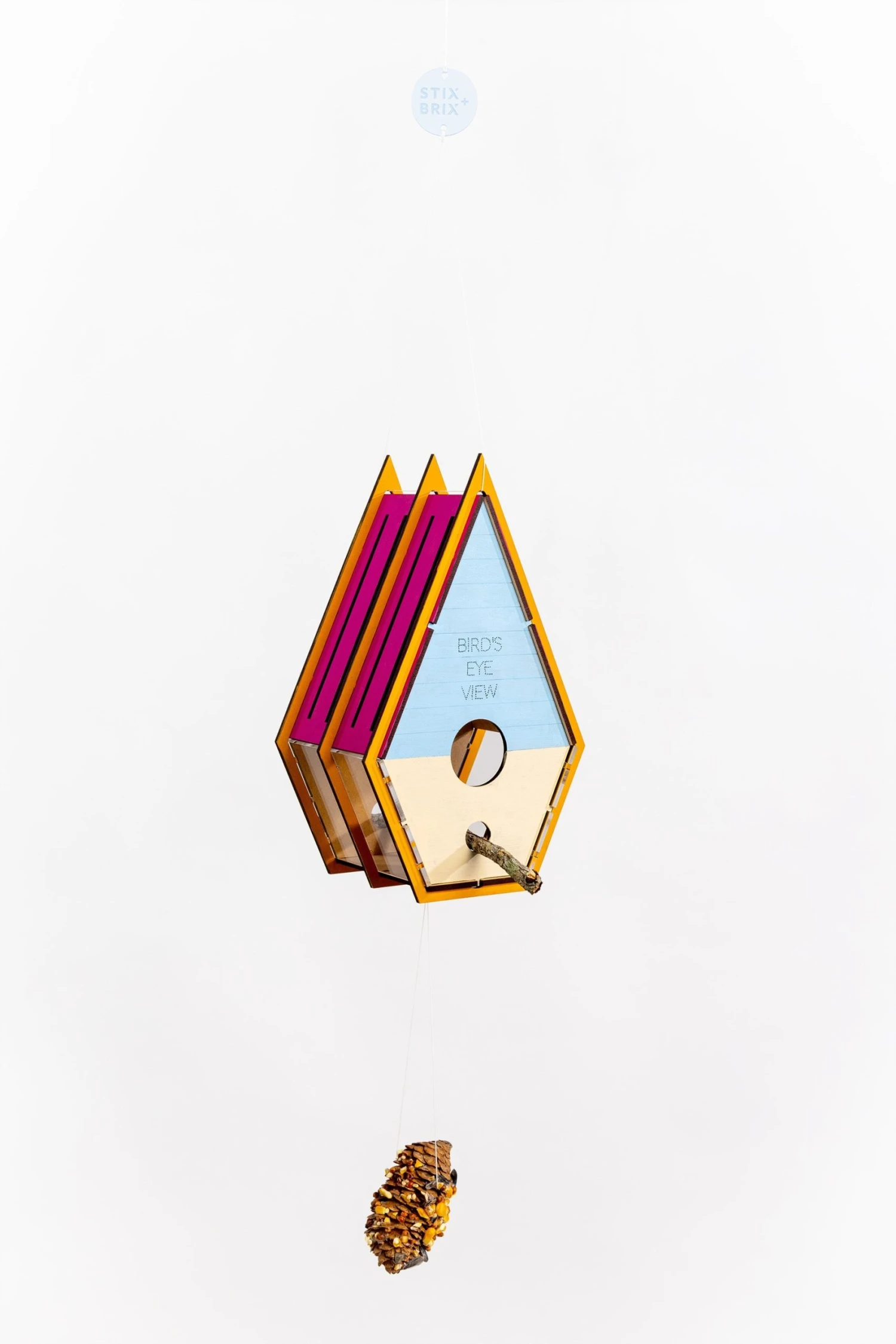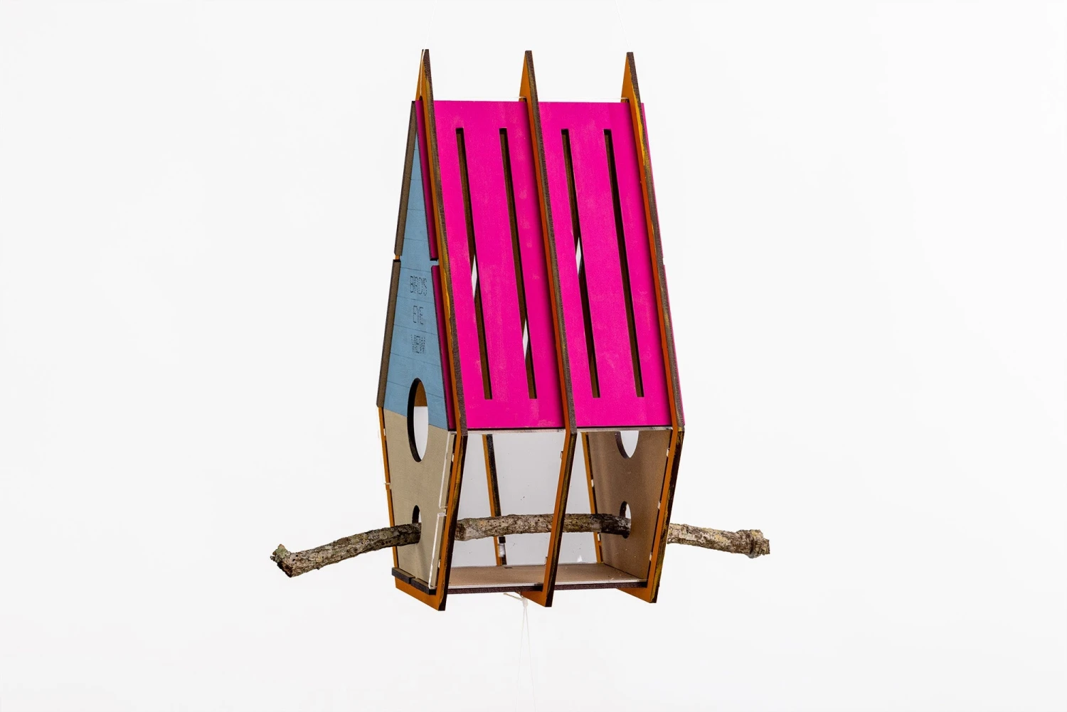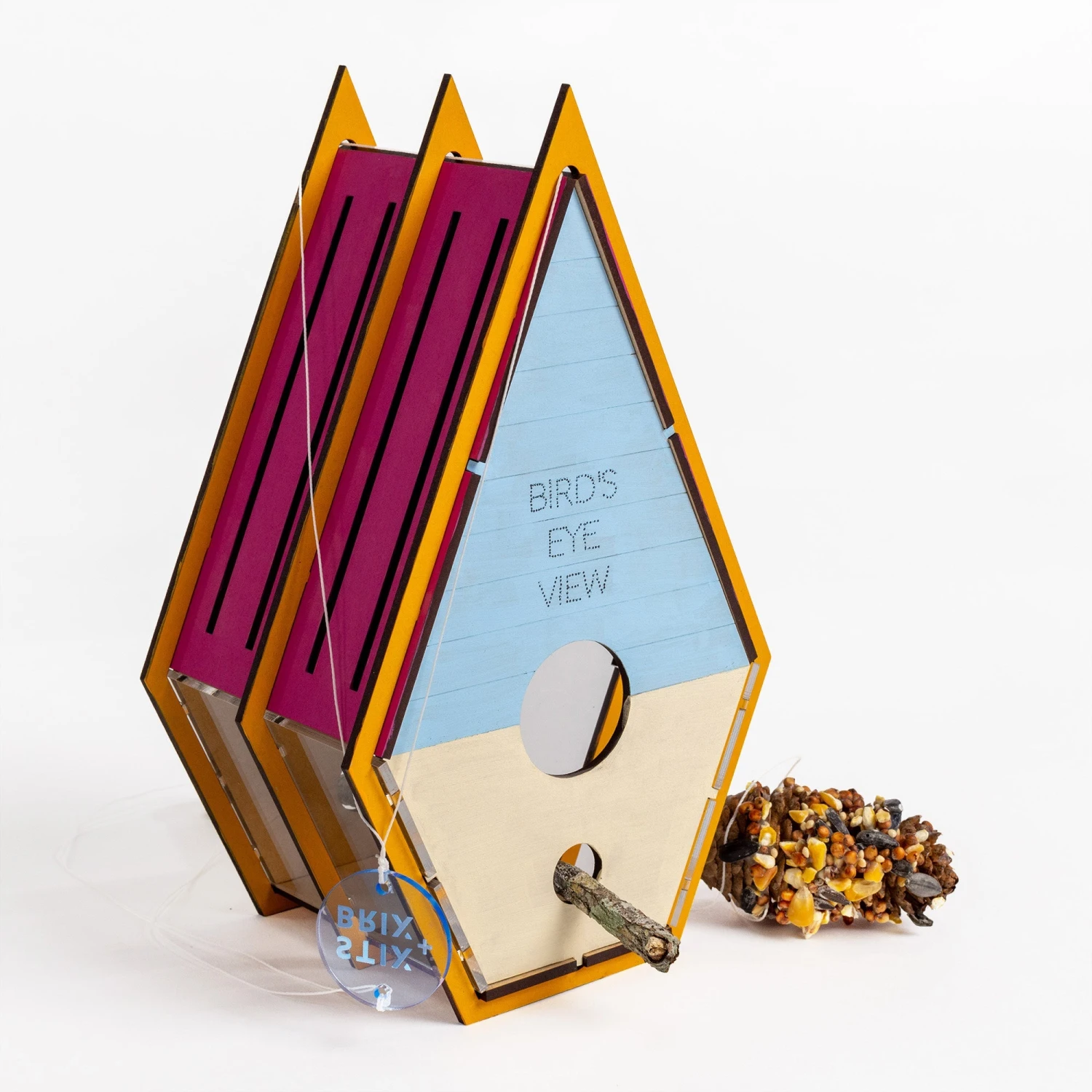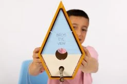 This is a unique and fun bird house + feeder. Ā Perfect for youngĀ builders, ages 6+.Ā A complet kit with all of the elements needed to build, paint and accesorize your bird house and a feeder. Hang it in your yard and peek at the birds throught the acrylic window.