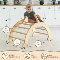 The climbing arch is constructed using eco-friendly birch plywood as its base, with dowels made from soft linden hardwood. To ensure a safe play experience, all wooden surfaces are meticulously sanded and polished to a smooth, splinter-free finish. Treated with a special blend of oils and waxes, this playground piece is perfect for indoor and controlled outdoor use. However, for the longevity of the product, we recommend avoiding areas with high humidity and extreme temperatures.
