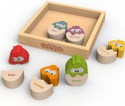 The color n eggs puzzle is a wooden puzzle, language learning toy, and character play set all in one! It’s a great first puzzle and helps develop fine motor and problem-solving skills. The chicken characters are great for inspiring storytelling. Parents and teachers will love introducing colors in English & Spanish. Clean up is easy with the wooden storage box that is included.