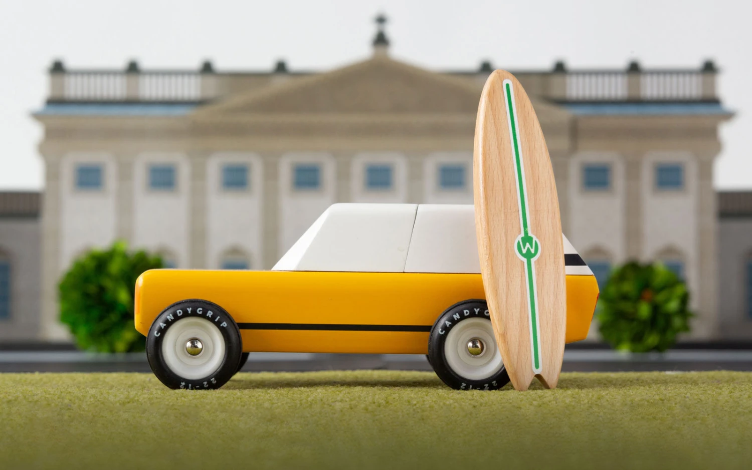 In a quest to overcome the rush for your afternoon tea – or tee? Must take the unpaved shortcut? Does your antiquing passion require copious amounts of comfortable travel? The Cotswold has you covered. The fancy toy vehicle for all connoisseurs. Comes with a magnetic surfboard and magnetic tow hook. Butler not included. Check out our short video HERE