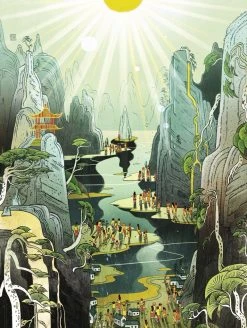 In the countryside of China, people move about alongside the mountains and take in the serene scene.