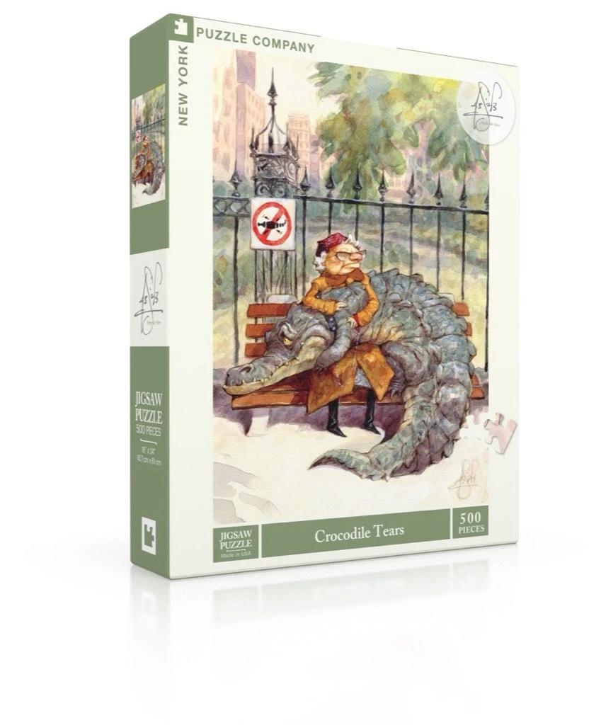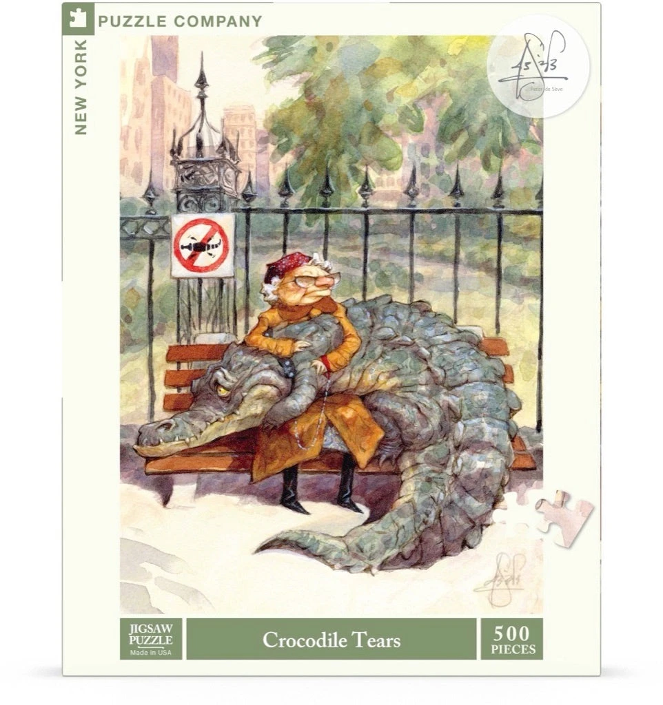 A woman defiantly sits on a bench with her worried pet crocodile.