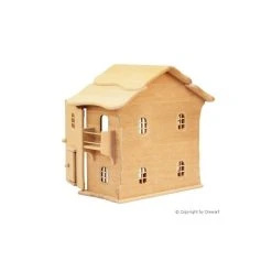 A two-storey dollhouse with a balcony. The front swings open for play access to the interior. Beautifully handcrafted and naturally finished.