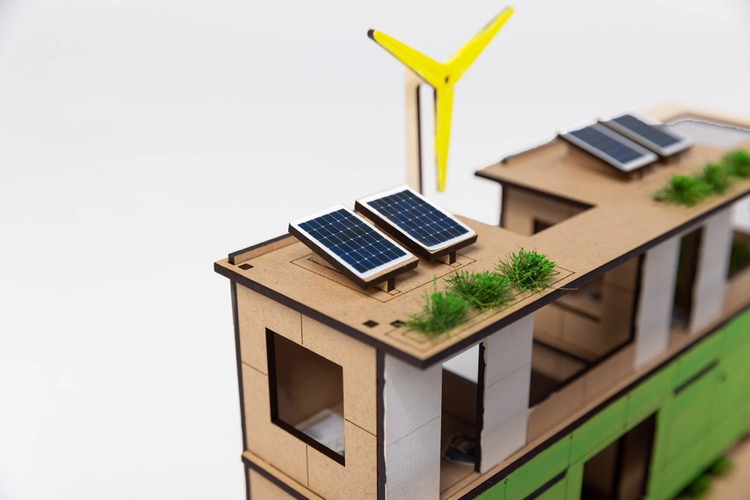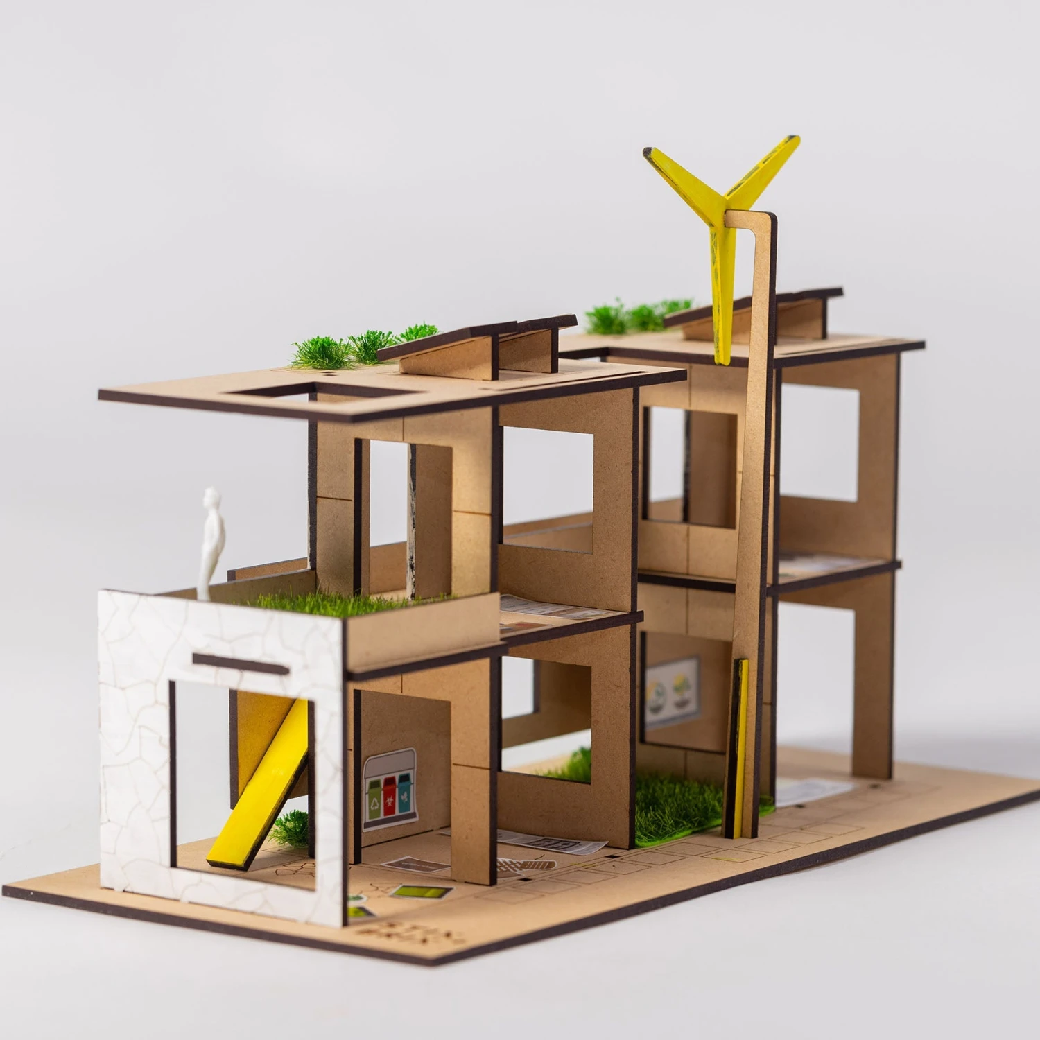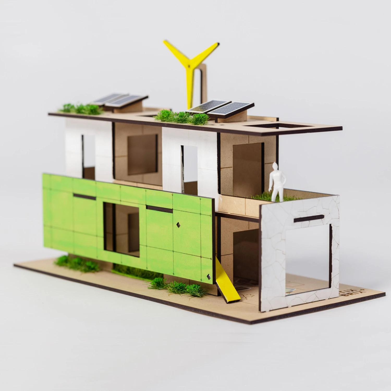 This is a true architectural model making kit, complete with all of the elements needed to build, paint and add special elements to your the Eco-house. Spark your curiosity with solar panels, a wind turbine, roof garderns and greenery. Explores the inside room and layout spaces with furniture stickers.