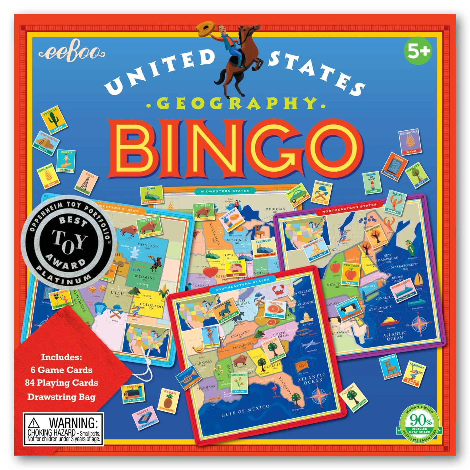 Each bingo card represents a different region of the U.S. First player to collect all the chips in their region and shout “Bingo” wins! The chips feature icons symbolizing key industries and wildlife associated with each state. Additional information about the states can be found on the back of each card.Â