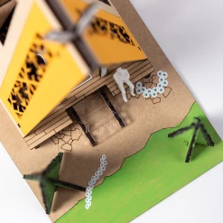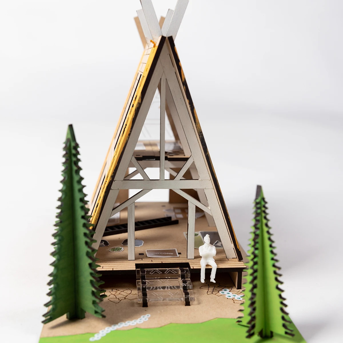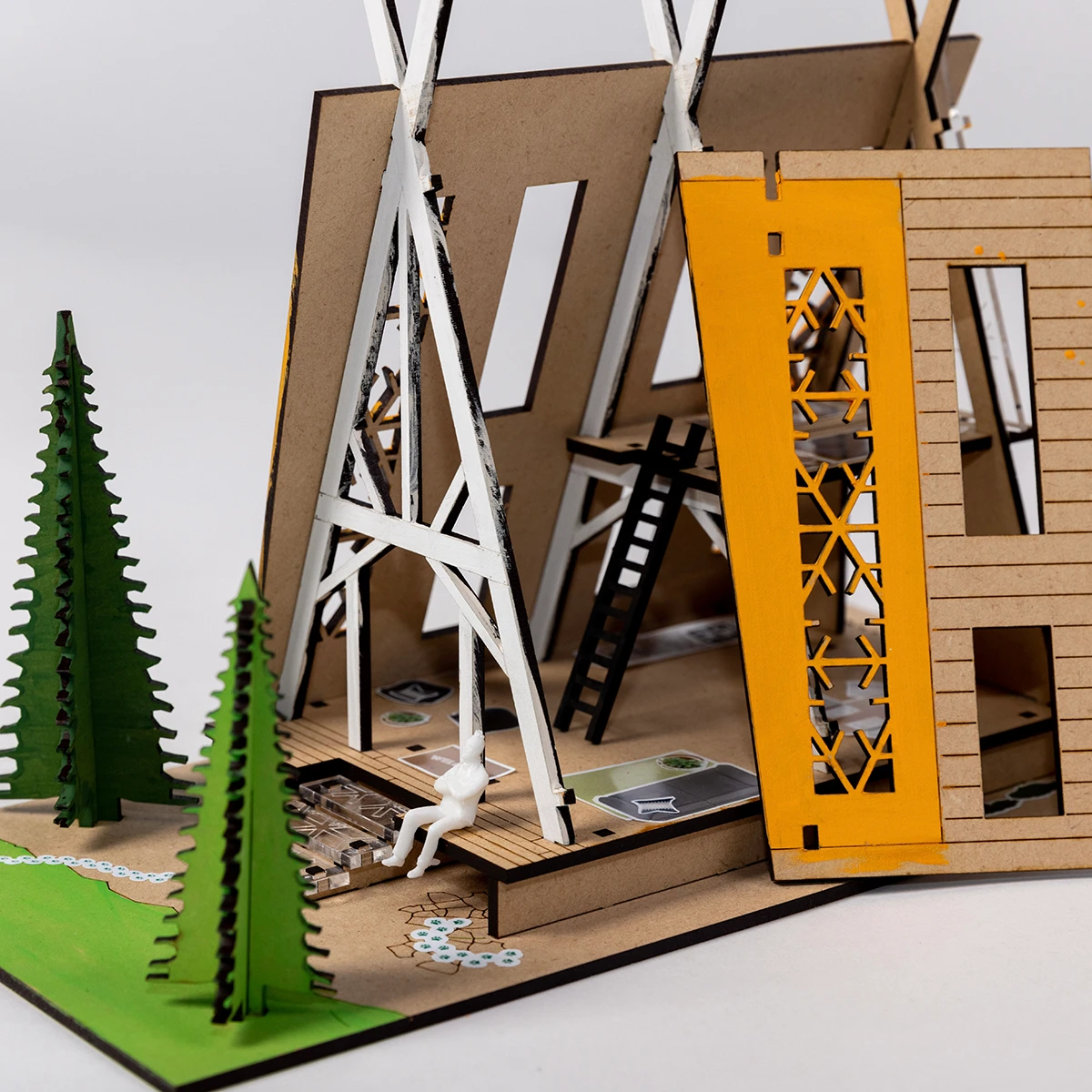 This is a true architectural model making kit, complete will all of the elements needed to build, paint and accesorize your Evergreen Cabin. Explore the inside of your a-frame with a removeable roof and layout rooms on both floors with furniture stickers.