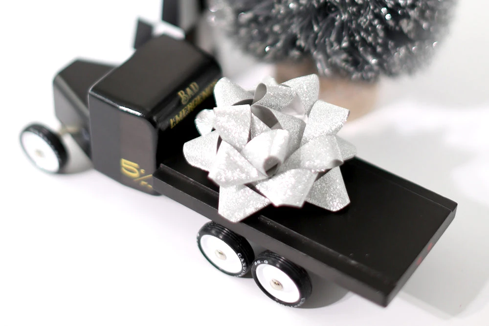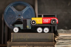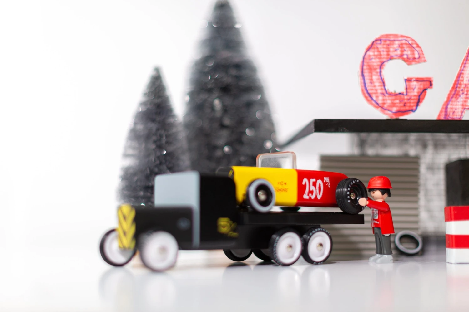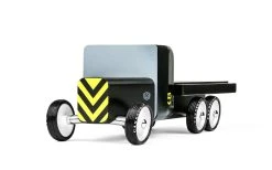 The toy itself has the yellow and black herringbone pattern on the front radiator, a long bed to haul other toys, and a magnet “hitch” making sure the towed cars stay in place.