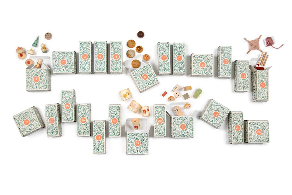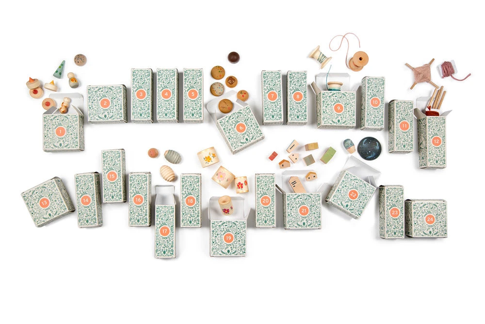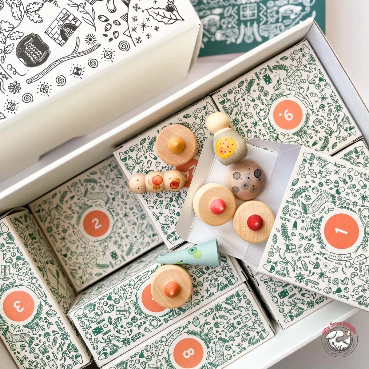 #1: Four candles and four elements for the waldorf kingdoms ⁄ #2: Tió ⁄ #3: Wooden stones ⁄ #4: Snowflake craft / #5: Finger puppet ⁄ #6: Xmas cookies ⁄ #7: Fairy craft set ⁄ #8: Little drumsticks ⁄ #9: Embroidery set ⁄ #10: Bulb babies ⁄ #11: Game of senses ⁄ #12: Amulet craft set ⁄ #13: Little mushrooms ⁄ #14: Silent bell ⁄ #15: Rainbow dice ⁄ #16: Treasure bag craft ⁄ #17: Wooly family ⁄ #18: Popcorn garland craft ⁄ #19: Cocoa cups ⁄ #20: String of pearls ⁄ #21: Magical city ⁄ #22: Night owl ⁄ #23: Joyful Nin ⁄ #24: Surprise!