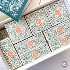 Each box contains a little piece that inspires holiday traditions, craft ideas, and stories. The set comes in a beautifully decorate box that can store the 24 boxes for next holiday and a booklet to ideas/suggestions by Grapat family.