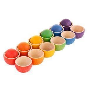 A rainbow assortment of wooden bowls and balls for tiny hands to stack or sort however they please. The 18 piece set comes with 12 bowls and 6 balls, handmade from sustainably harvested beech wood. Each is colored using water-based, non-toxic dyes and finished with vegetable wax. Designed to encourage free play and stir the imagination. Includes a cloth bag for easy storage.