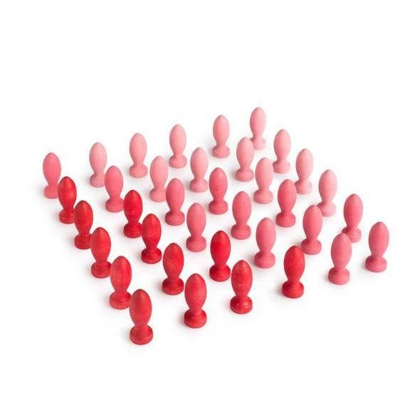 We chose the amount of 36 in order to make round creations. Depending on the needs of the kids, they can enrich symbolic play, they can be used as pretend food for cooking or elements to transport.