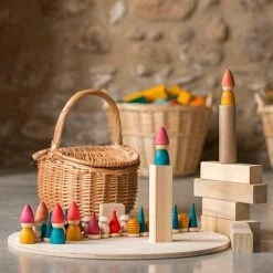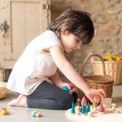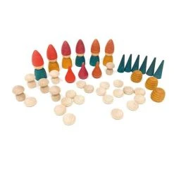 The elements of this set allow the child to create invented Small Worlds. There are not instructions and rules involved. It allows the kids to give it the shape that each of them needs to be able to generate their own proposal. The coins can be roads or stones, the cones can became trees, the wooden gures can be transformed into magical beings or real people.