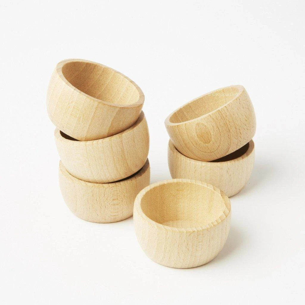 Six natural wood bowls for sorting and stacking. Play a memory game or store a special treasure. The possibilities are endless!