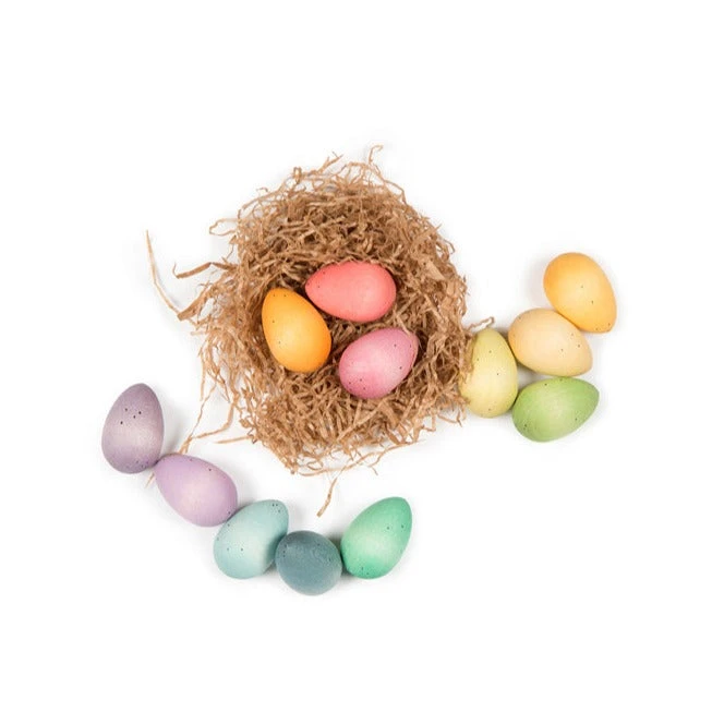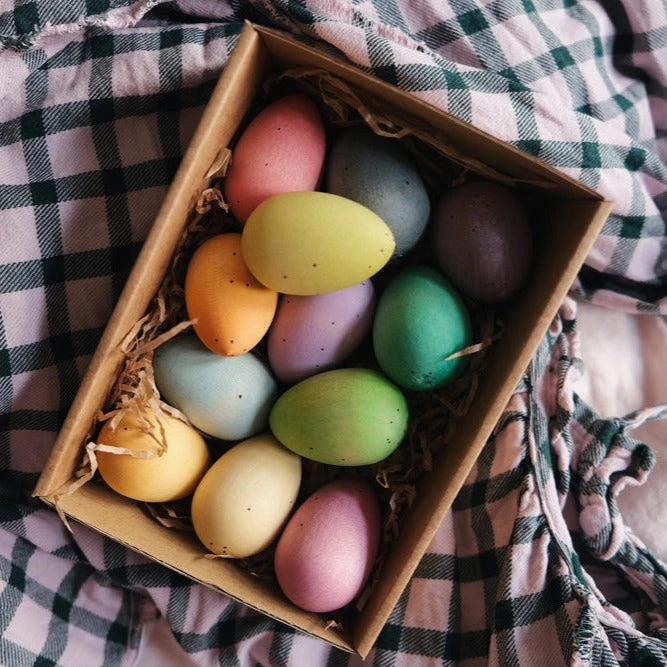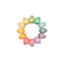 12 eggs that come in 12 colours of the rainbow to celebrate spring, decorate for easter, cook them in the play kitchen or transport them on a lorry. Open-ended fun for your little ones in the softest colours.
