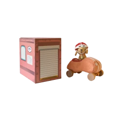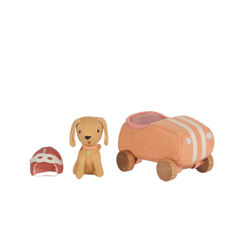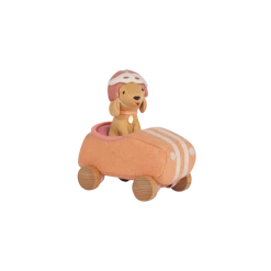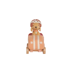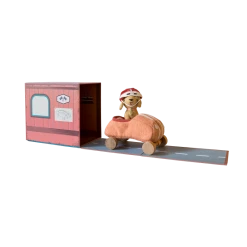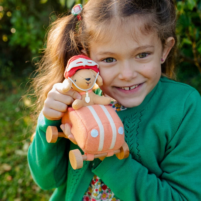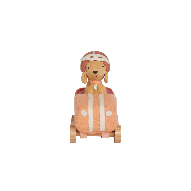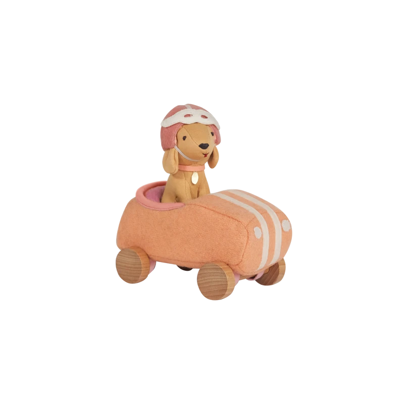 When the day is done, Dog-Go Racer Girl loves to park in her garage box, ready to play again tomorrow.Made from a wool blend with embroidered features, nestled in a classic car with wooden wheels.