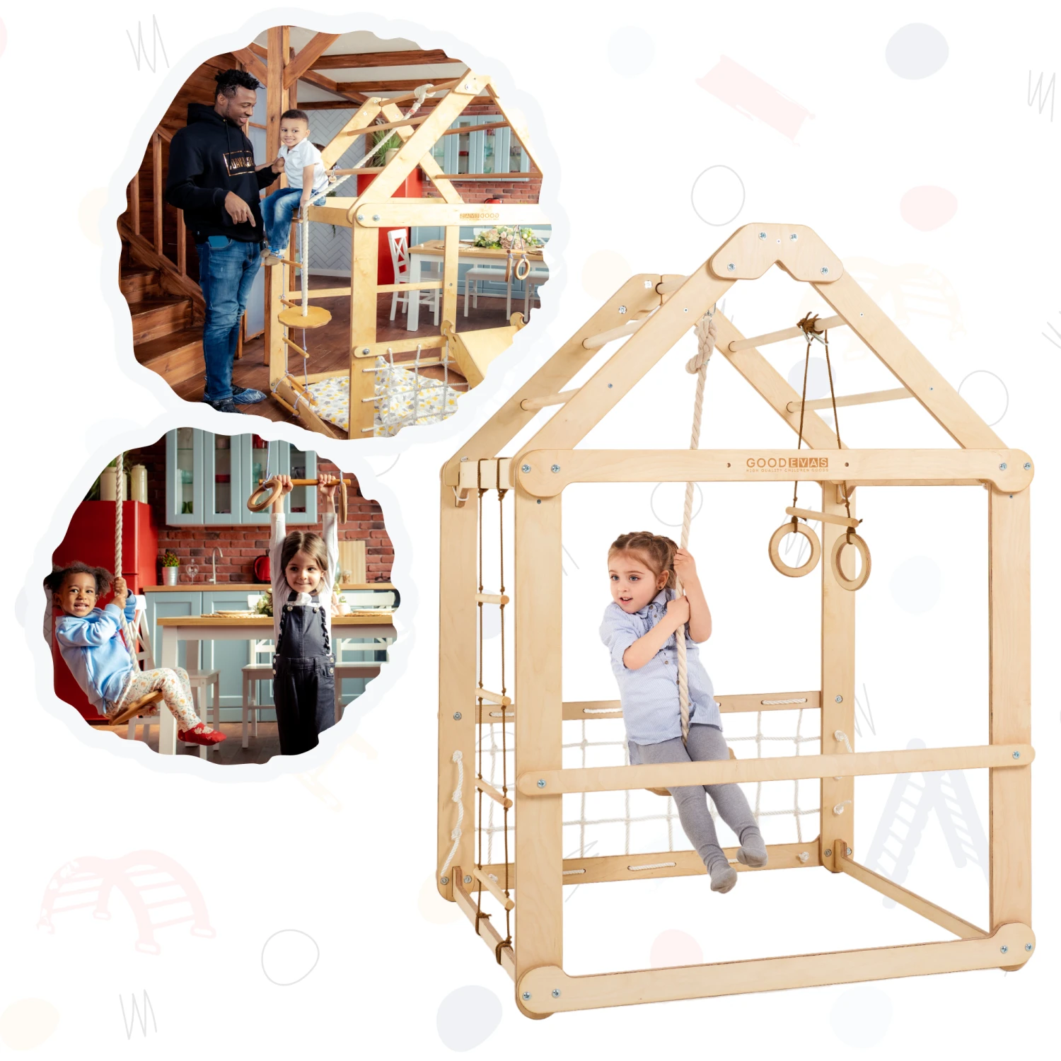 Introducing the Goodevas Wooden Playhouse, a haven for toddlers inspired by the Montessori approach. Grant your child the autonomy to explore, innovate, and design their unique play experiences. This playhouse serves as a catalyst, nurturing vital attributes like balance, coordination, and motor skills! Featured activities encompass: