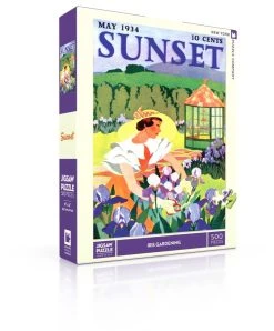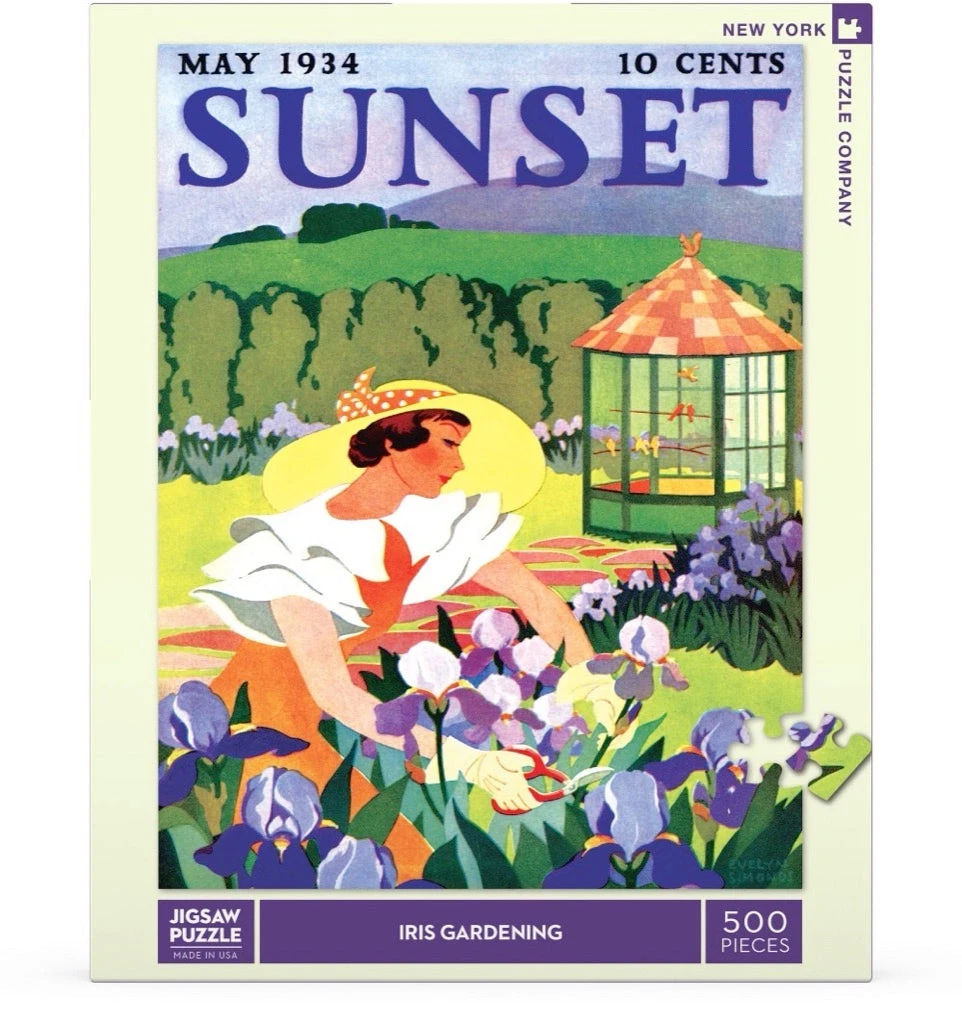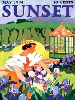 From the cover of Sunset Magazine in 1934, Evelyn Simonds paints a colorful scene of a lovely lady in a broad brimmed hat tending to her garden of irises, with an aviary and hills in the background.