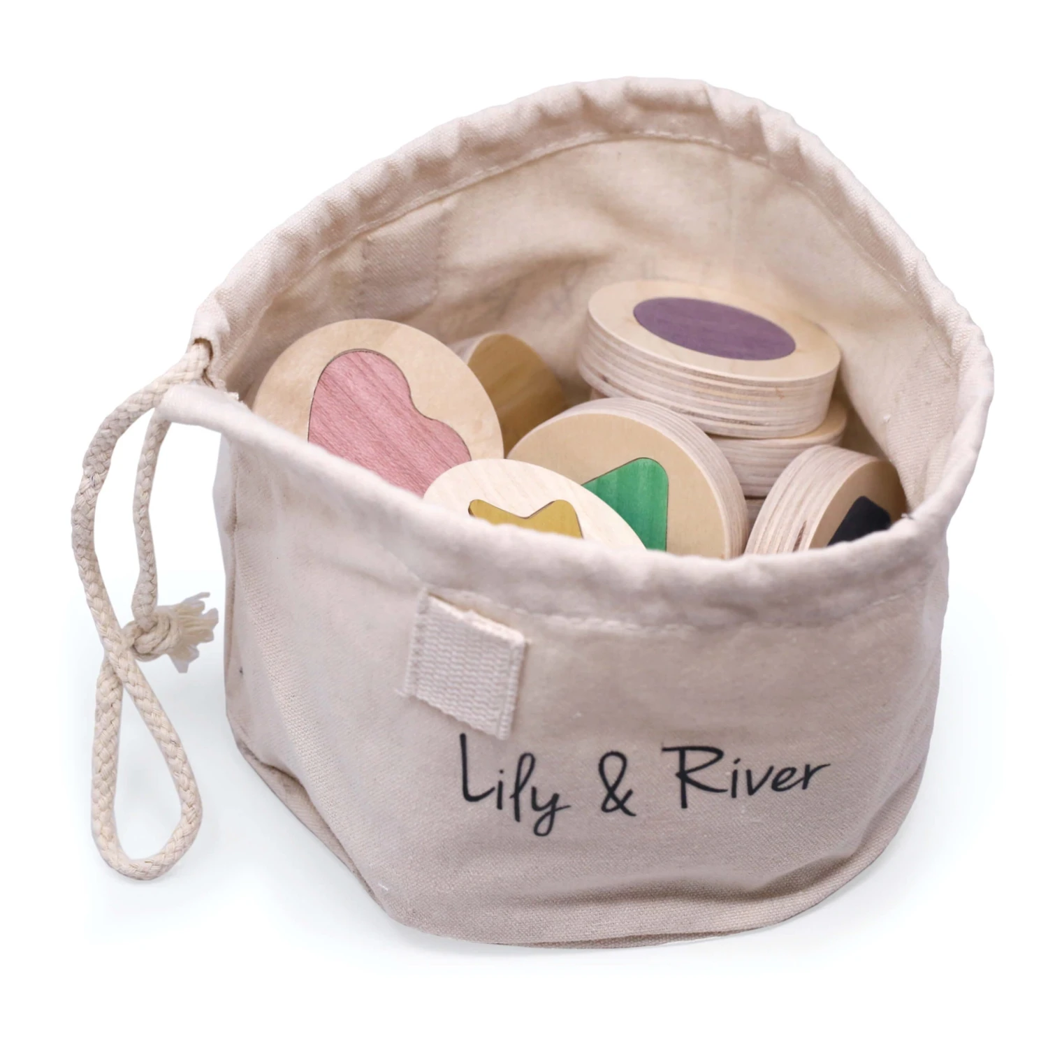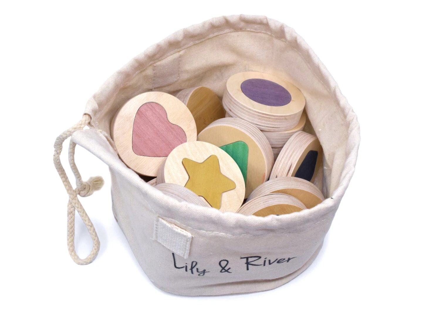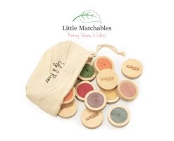 Practice Memory, Shapes, and Colors! Little Matchables is our memory game designed to practice shapes, colors, memorization, and fine motor skills. Little Matchables game set includes 18 pieces and a Little Creator friendly canvas string-tied pouch for simple storage. For ages 18mo to 6 years.