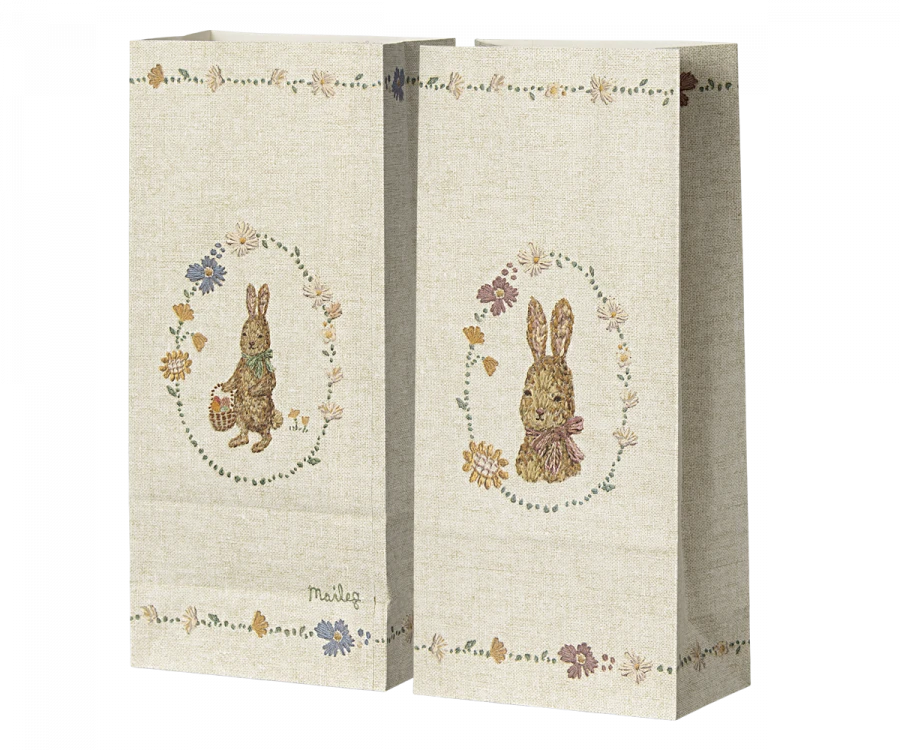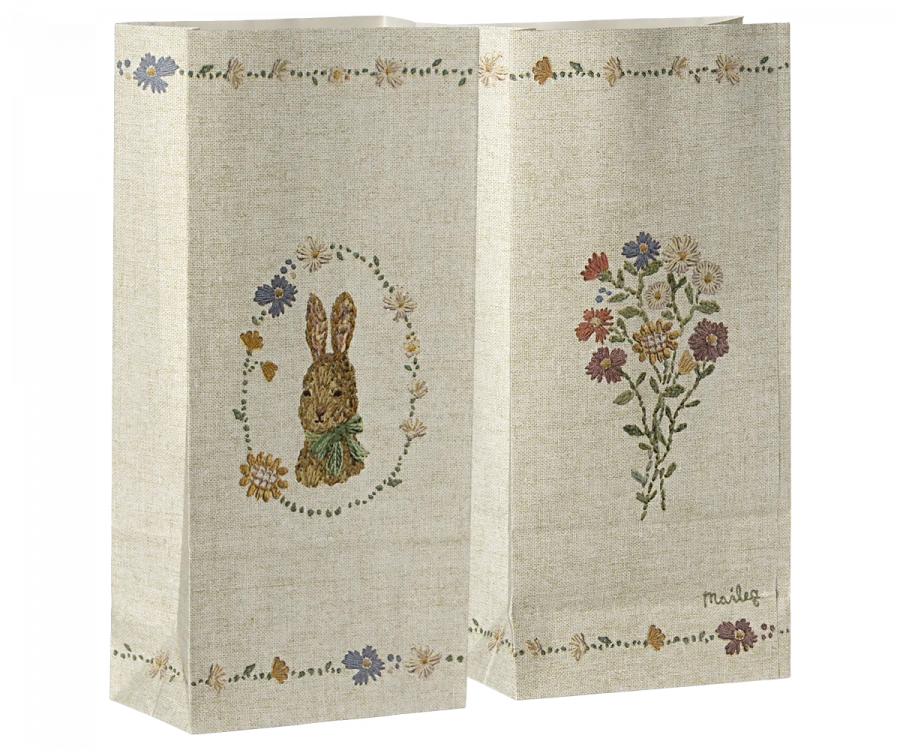 Easter is the time of small surprises for your loved ones. Use these paper bags for eggs, soft bunnies or any gift. The decoration on these bags started with Dorthe Mailil’s personal embroideries and ended up as beautiful print.