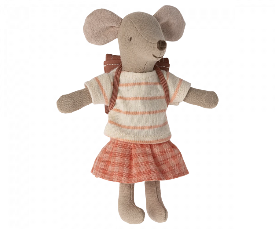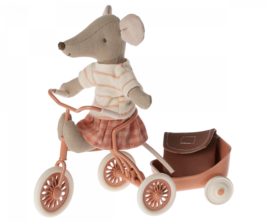 Big sister mouse is ready for a day in school, carrying her backpack on the back. She has magnets in her hands so she can hold the handles of the tricycle for a fast trip.