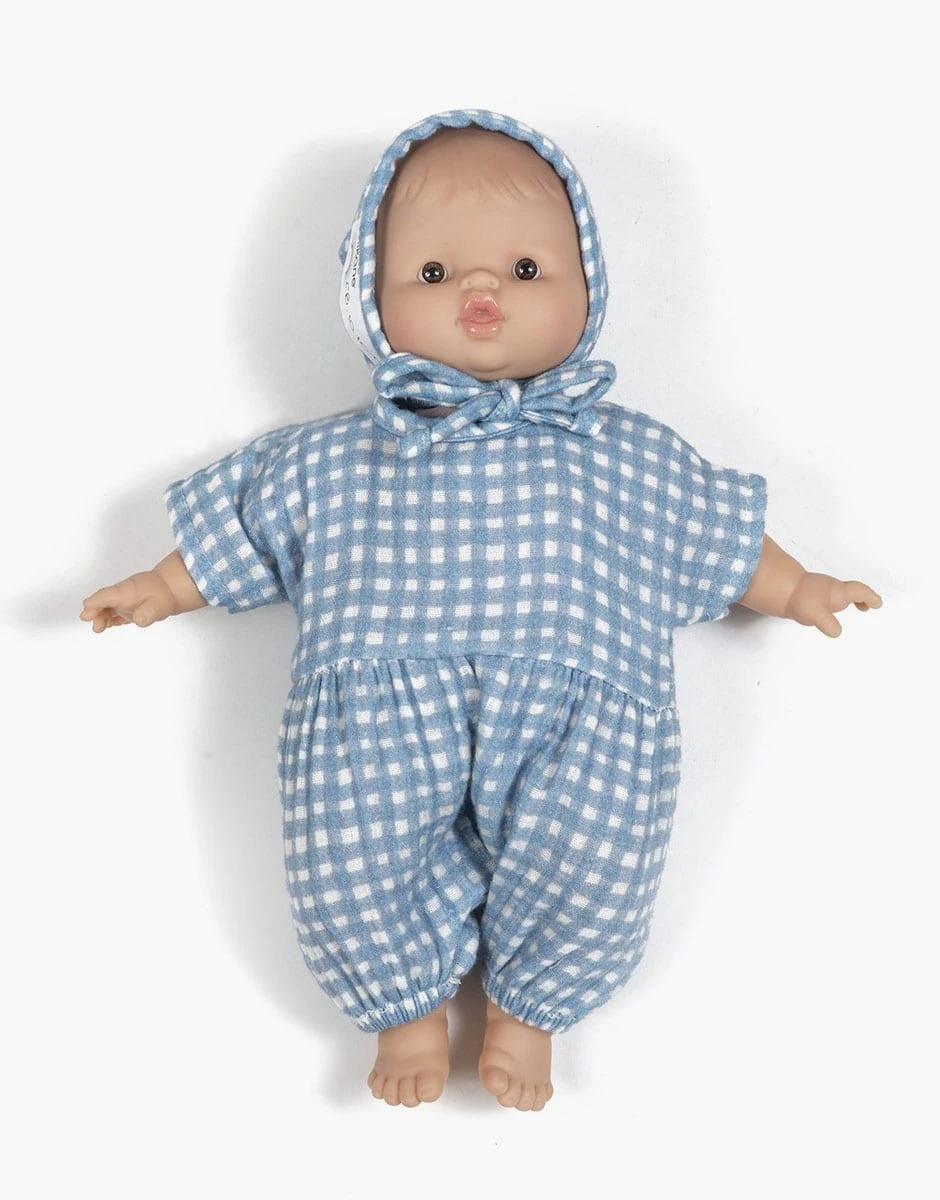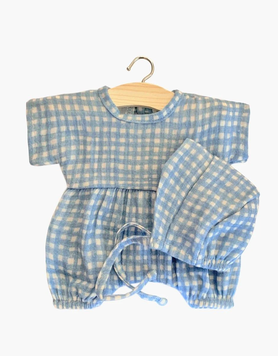 Design, development & manufacture made in France. Barboteuse Noa Vichy bleu et son béguin fille
