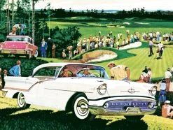 Seems like everyone in town has shown up for the local golf tournament. Roll up onto the green in style in your brand new 1957 Oldsmobile Super 88 in this jigsaw puzzle featuring a vintage car advertisement. Frame it once completed and you’ll have a great piece of vintage art for your home.