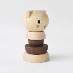 Cat Wood Stacker: Recommended for ages 18 months +. Measures 4.75 inches tall. Made of natural Rubberwood with a child-safe finish.