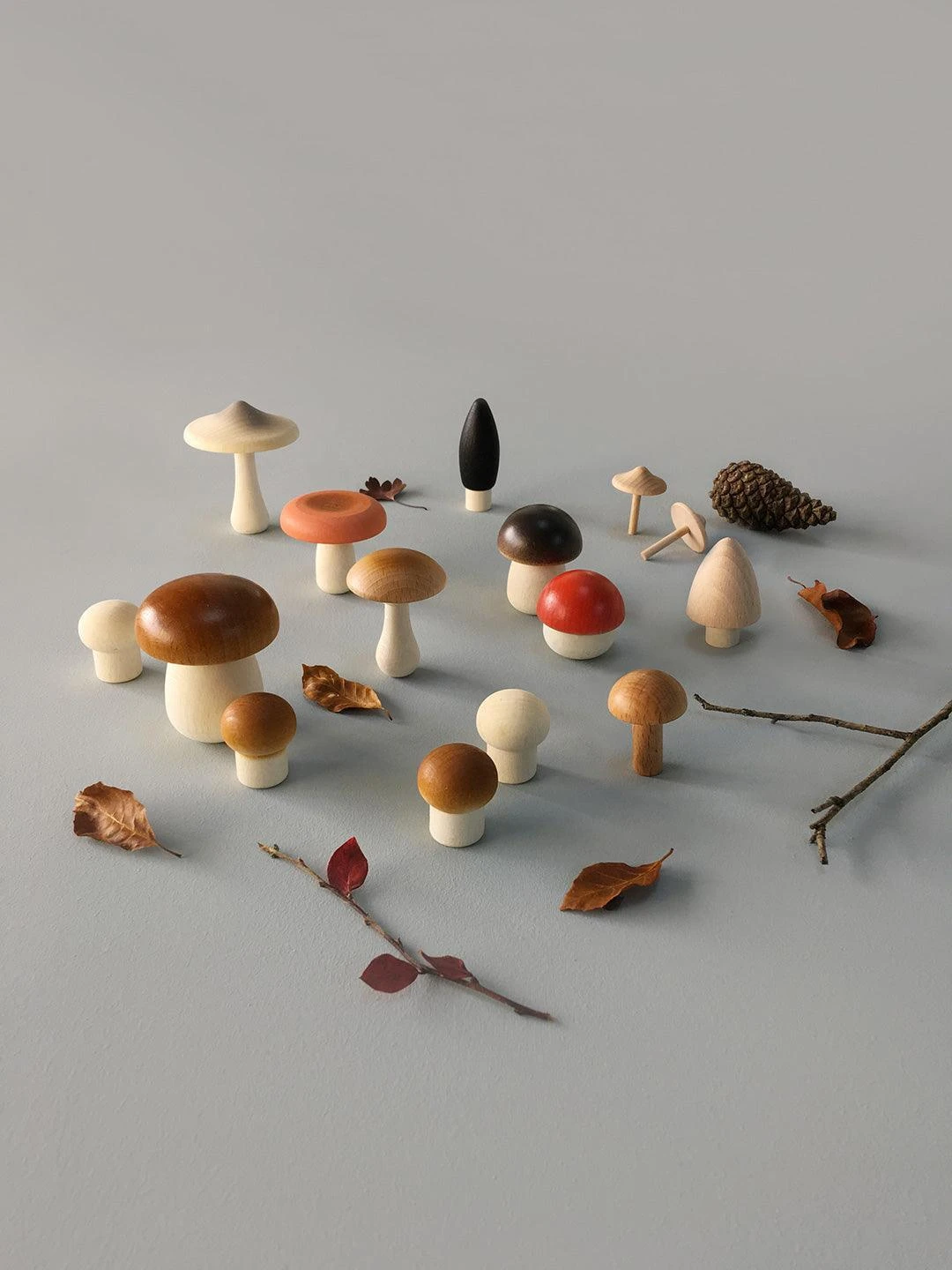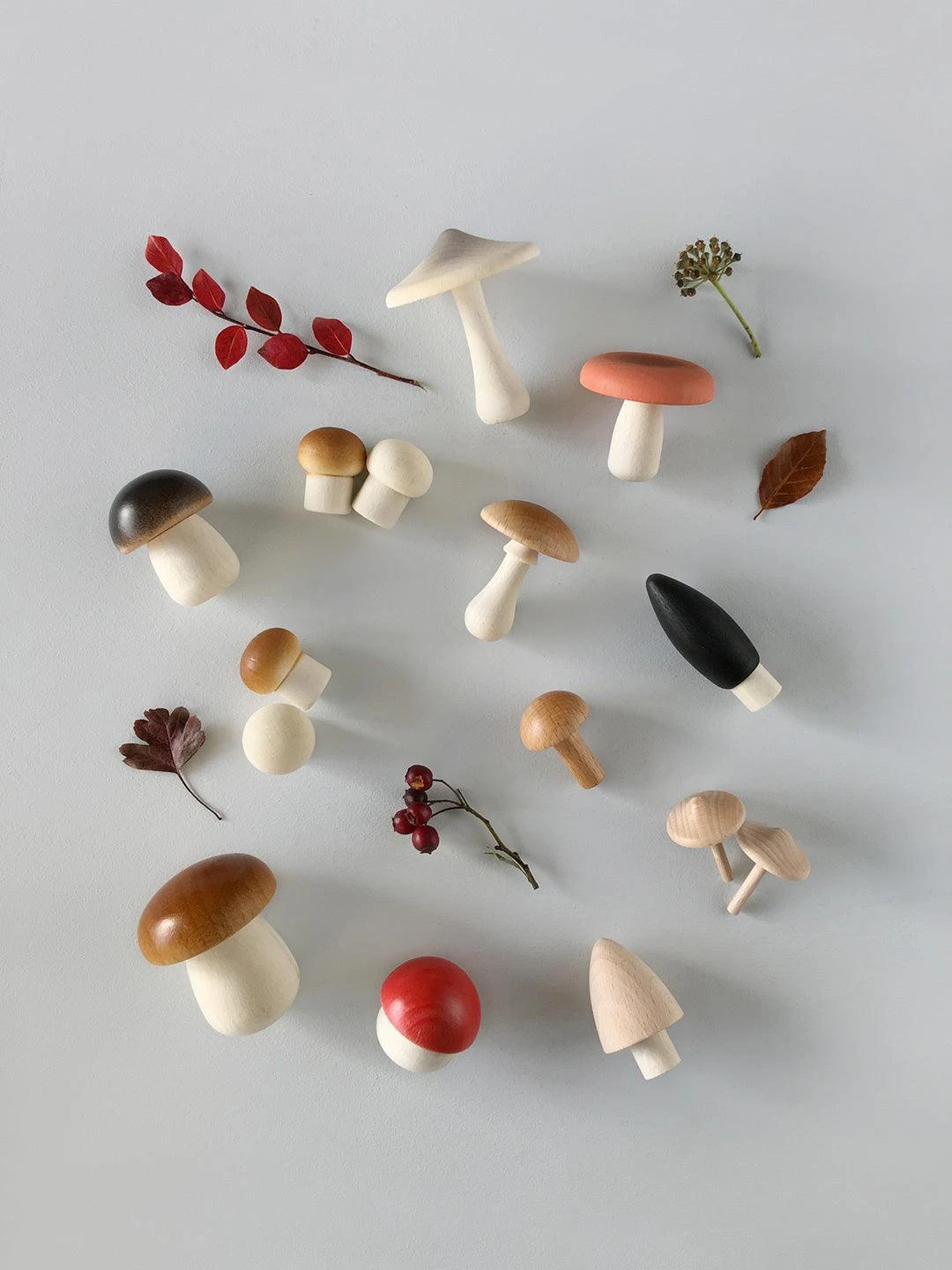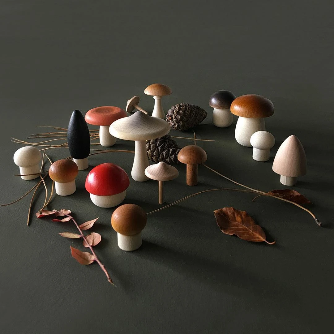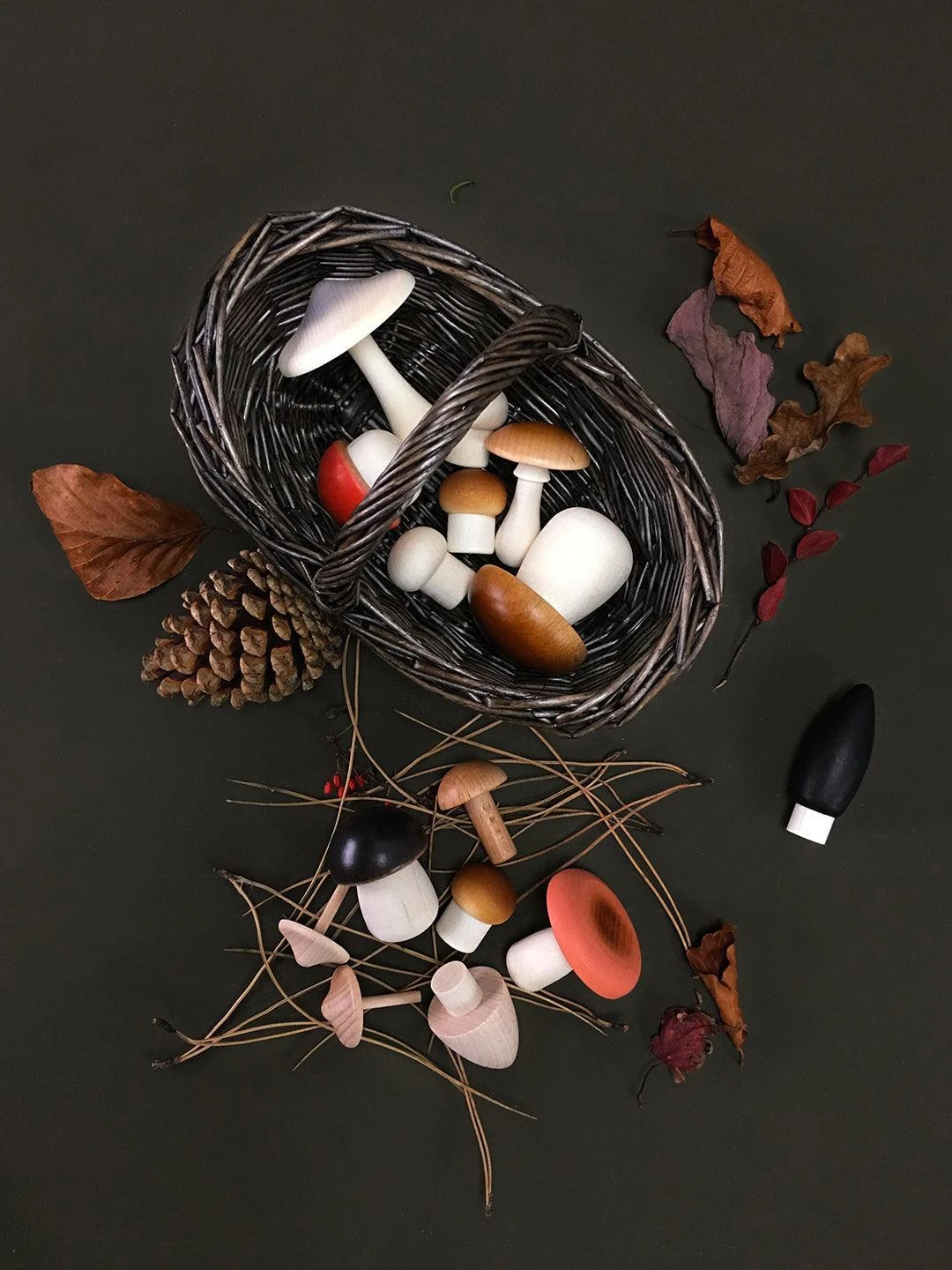 Beautifully made set of 15 wooden mushrooms in an artisan-made rattan basket for pretend play & decoration.