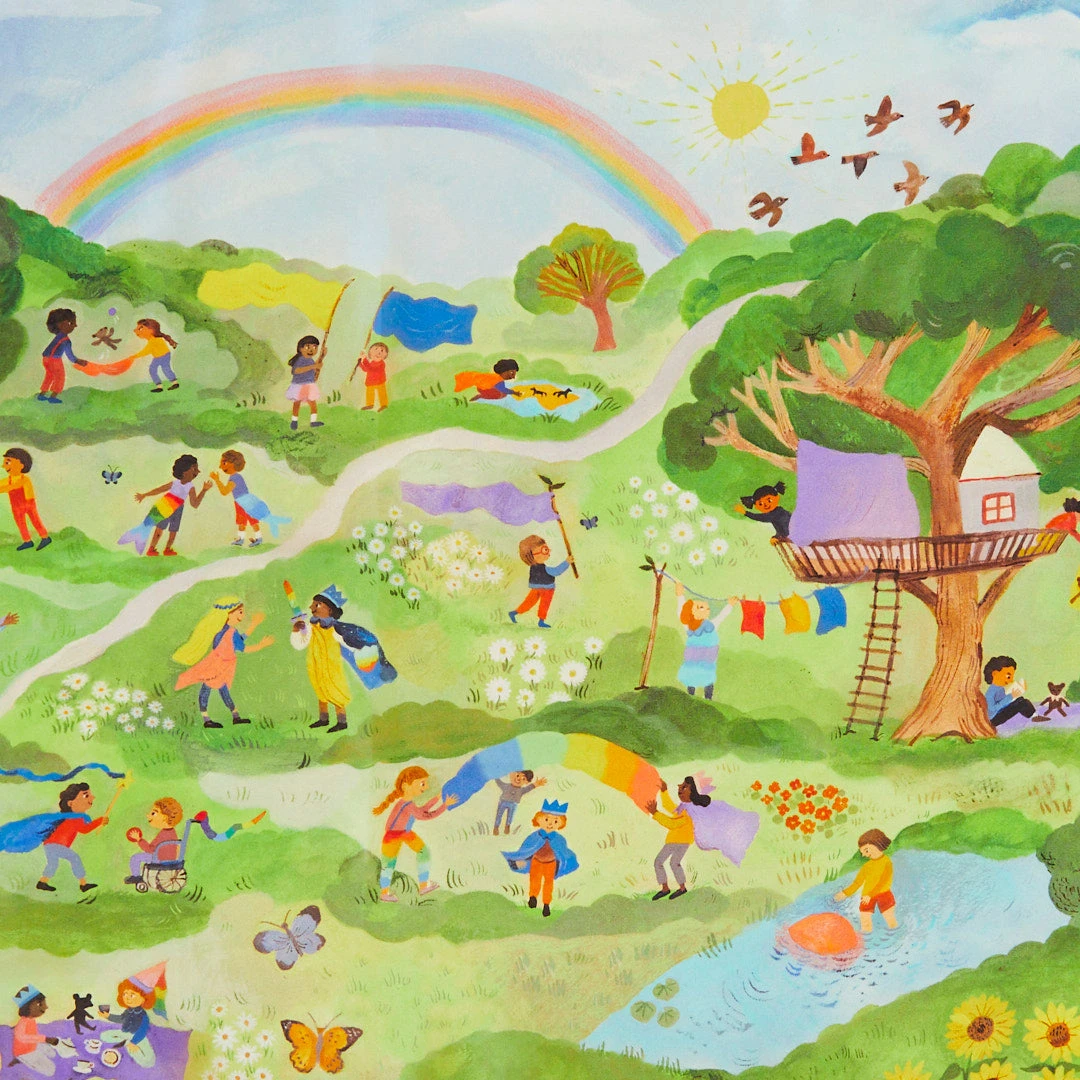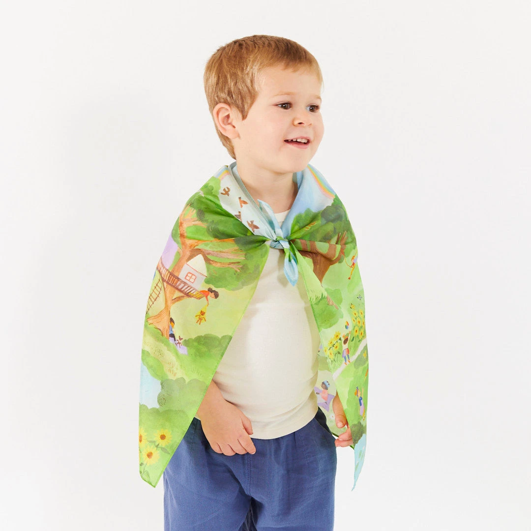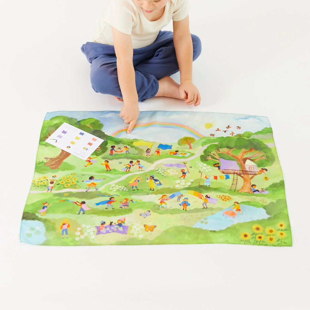 Seek & find your favorite open-ended toys and dress-up pieces and discover new play ideas along the way. This 22 x 29 inch Playsilk features original artwork by Gemma Koomen, showcasing each beloved toy from the magical world of Sarah’s Silks.