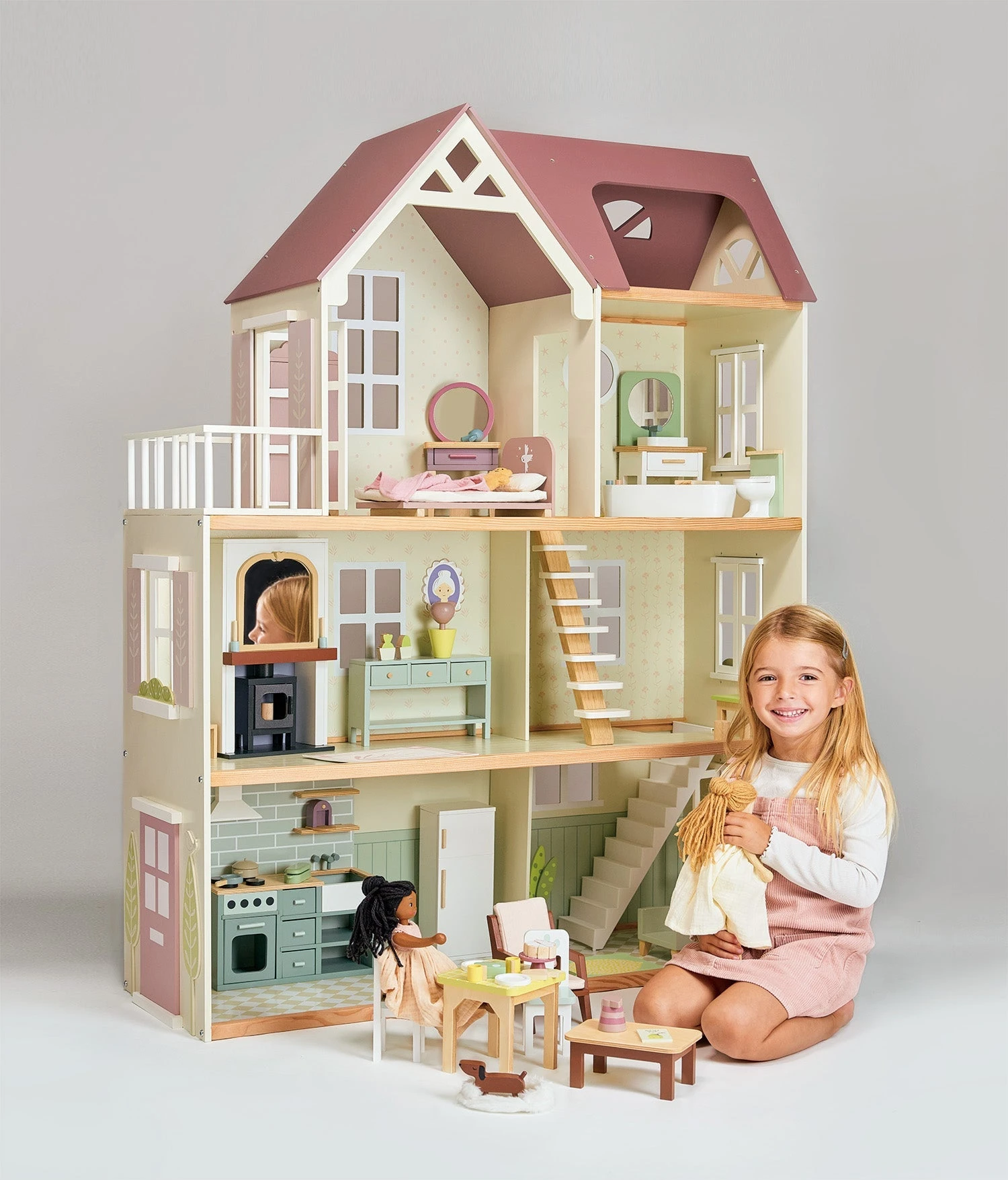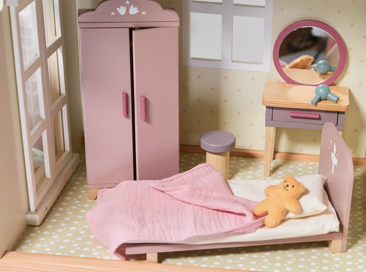 A large open-fronted wooden dolls house scaled for 9.84” / 25cm dolls. Beautiful contemporary soft colours and detailed illustrations make this house unique and premium. The gabled roof and attic space, opening shutters and front door with windows at the back panel allow light to flood into the spacious interior. Access to a balcony on the second floor gives extra interest and space to play. Furniture included.