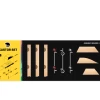 A wooden stacking tree trunk with 19 stylishly colored animals and plants including an owl, a bat, a wolf, a squirrel, a woodpecker, an acorn, a mummy pig with her baby, a caterpillar, five leaves, a toadstool, a rabbit, a hedgehog, a bird, and a bird in a nest.
