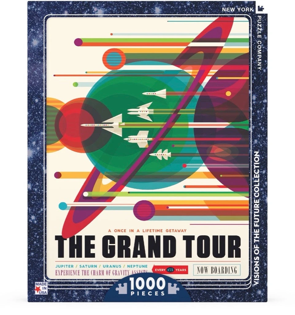 This puzzle of a NASA JPL Visions of the Future Poster advertises the alignment of all outer planets that occurs only once every 175 years. NASA’s voyager mission used gravity from each of the planets to propel it to the next. What would it be like if you could ride one of these shuttles as a tourist?
