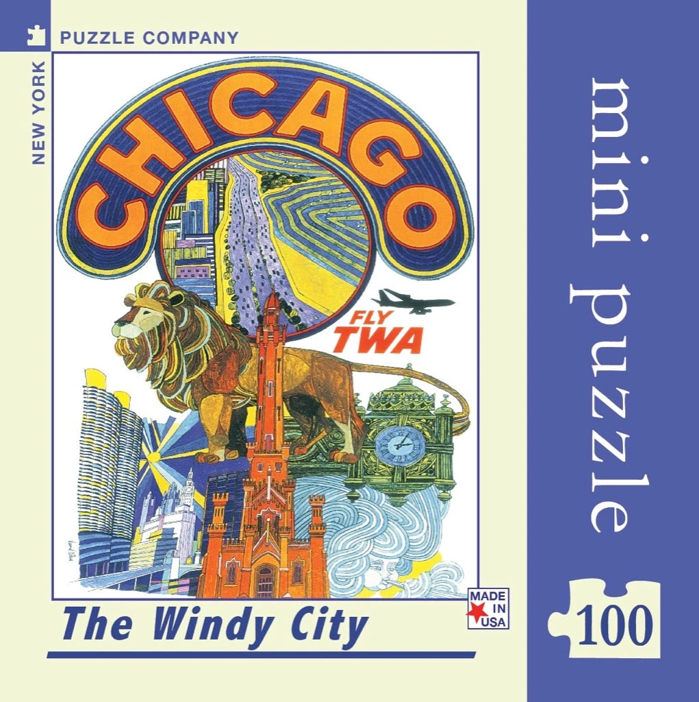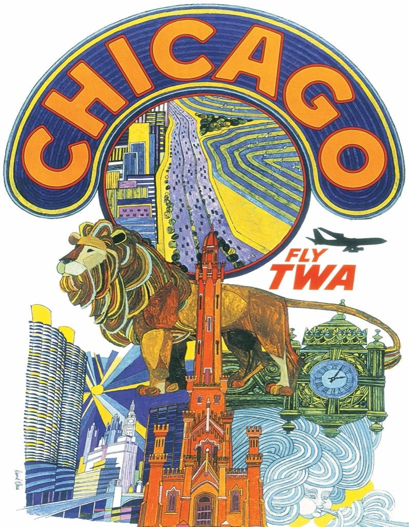 From a vintage TWA airlines poster, capture the excitement and history of the new and old Chicago, featuring Marina City, the Art Institute’s lion, the Water Tower, Marshall Field’s clock and Lake Shore Drive. And, of course, the wind!