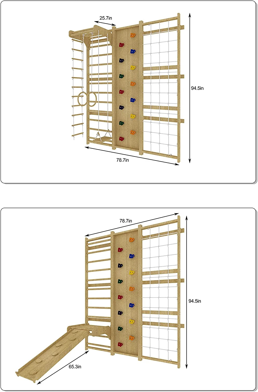 With safety as our top priority, this climber is crafted from solid wood with a natural finish, offering not just durability but also adding a touch of elegance to any space. The carefully spaced rungs and bars provide a secure grip, ensuring stable and safe play. Its compact design efficiently saves space while offering a dedicated area for vigorous play.