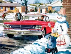 From a classic red Pontiac, a couple offers warm greetings to a child playing in the snow.