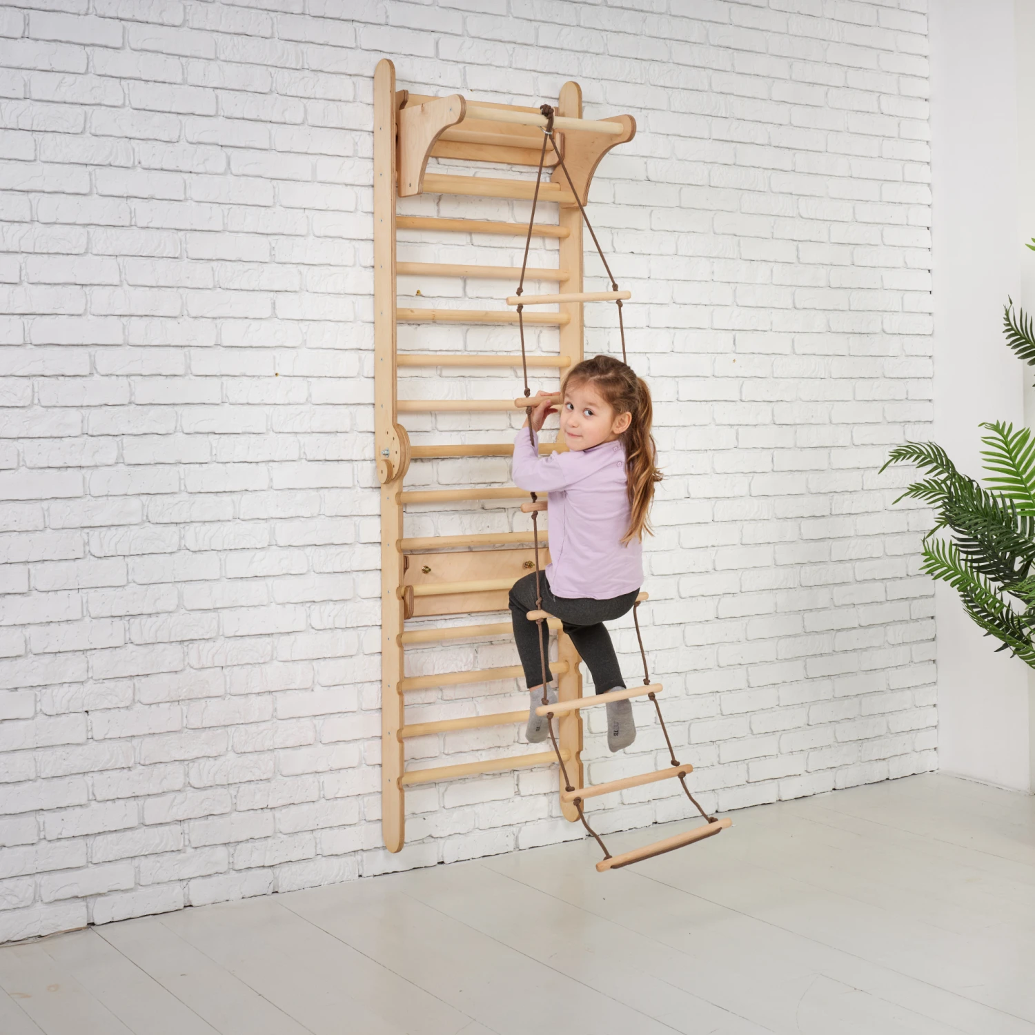 - A multifunctional swing, crafted from natural spruce wood and non-toxic multifilament polypropylene rope.
