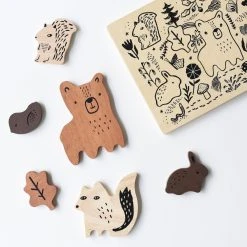 Woodland Tray Puzzle: For Ages 2+. Measures 10 inches x 7 inches. Made of natural Rubberwood. Do not submerge in water. Not intended for teething.